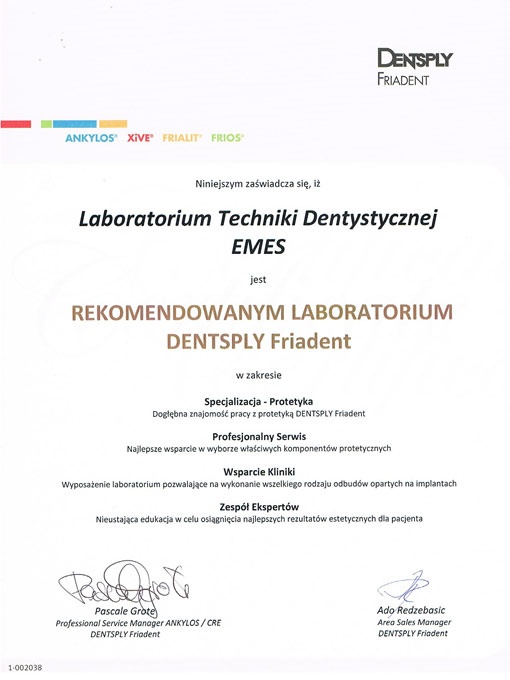 W naszym laboratorium stawiamy na jakość, precyzję i bezpieczeństwo – potwierdzają to liczne certyfikaty zgodności z europejskimi normami. Regularnie poddajemy się audytom i szkoleniom, by być na bieżąco z najnowszymi standardami w protetyce stomatologicznej. Każdy etap naszej pracy opiera się na sprawdzonych procedurach i najwyższych standardach jakości. Poniżej prezentujemy nasze aktualne certyfikaty, będące gwarancją profesjonalizmu i zaufania.